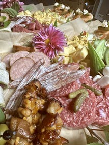 bestaat uit met wraps met roomkaas en serranoham, wraps met zalm, spiesjes mozzarella tomaat, olijven, garnalen en yakitori, diverse soorten kaas, grilworst, ossenworst, fuet worstjes, komkommertjes, noten en pindamix en bladerdeeg zoutjes (op de plank liggen 3 hapjes pp).